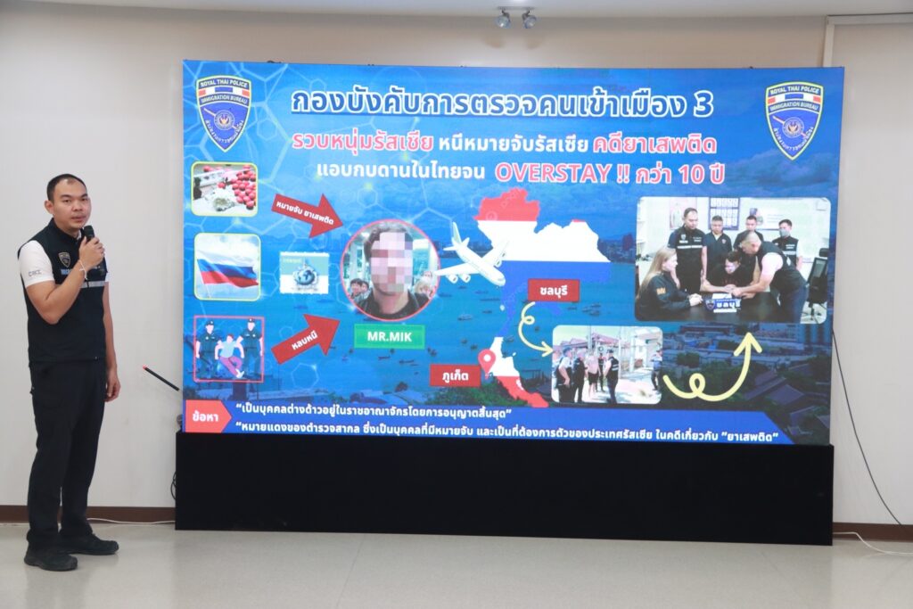 พล.ต.ต.พันธนะ กล่าวว่า เมื่อประมาณต้นเดือน ต.ค.66 ตม.จว.ชลบุรี ได้รับแจ้งข้อมูลจากอาสาสมัคร (volunteer) ว่ามีคนต่างด้าวสัญชาติรัสเซีย มีพฤติการณ์น่าสงสัย จากการสืบสวนพบว่าคนต่างด้าวรายนี้คือ MR.MIK (นามสมมุติ) สัญชาติรัสเซีย ซึ่งการอนุญาตให้อยู่ในราชอาณาจักรได้สิ้นสุดแล้ว โดย MR.MIK มักจะไปพักอาศัยอยู่ในพื้นที่ จว.ภูเก็ต และ จว.ชลบุรี นอกจากนี้ยังพบว่า เป็นบุคคลตามหมายจับที่ทางการรัสเซียต้องการตัวกลับไปดำเนินคดีในความผิดเกี่ยวกับยาเสพติด และองค์การตำรวจสากลได้ออกประกาศสีแดง (INRETPOL Red Notice)
