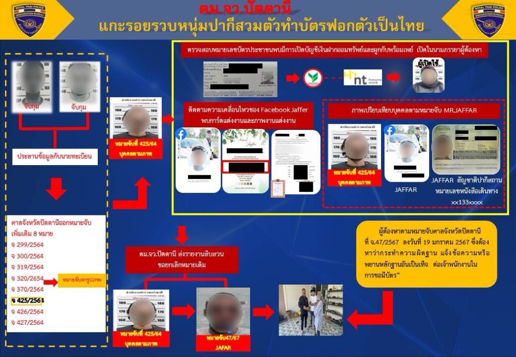 นอกจากนี้จากการประสานข้อมูลกับนายทะเบียนอำเภอแม่ลานยังทราบว่านาย IKRAM ที่เคยโดนจับกุม และถูกผลักดันส่งกลับออกนอกราชอาณาจักร มีความสัมพันธ์เป็นพี่ชายของนายซามิฯ และมีการสวมบัตรประชาชนเช่นเดียวกับนายซามิฯ ต่อมาทางอำเภอแม่ลานได้ทำการจำหน่ายบัตรฯ อีกจำนวน 9 บัตร และได้แจ้งความร้องทุกข์กับพนักงานสอบสวน สภ.แม่ลาน เพื่อให้ดำเนินคดีกับผู้ที่เกี่ยวข้อง โดยศาลจังหวัดปัตตานีได้อนุมัติออกหมายจับผู้ถือบัตรดังกล่าว จำนวน 9 หมายจับ รวมของนาย IKRAM ซึ่งจากคำให้การของซามิฯ ทราบว่าผู้ต้องหารายดังกล่าวไม่ได้อยู่ในราชอาณาจักรไทย ต่อมาชุดสืบสวน ตม.จว.ปัตตานี ได้นำหมายจับทั้ง 9 หมาย มาตรวจสอบพบว่า หมายจับศาลจังหวัดปัตตานี ที่ จ.425/2564 ลงวันที่ 29 ธันวาคม 2564 ระบุชายไม่ทราบชื่อตามรูปภาพ บุคคลตามหมายจับนี้น่าจะกระทำความผิดด้วยการสวมบัตรประจำตัวประชาชนของนายอับดุลราชีพ ดาโอ๊ะ เกิดวันที่ 30 เมษายน 2535 อยู่ที่ ซ.กำปงบารู ต.บางนาค อ.เมืองนราธิวาส จว.นราธิวาส โดยแนวทางการสืบสวนพบว่าบุคคลดังกล่าวน่าจะเป็นบุคคลคนเดียวกัน จากการนำข้อมูลการเปิดบัญชีธนาคาร ข้อมูลทางโซเชียล (FACEBOOK) โพสต์รูปงานพิธีแต่งงานกับภรรยาซึ่งเป็นคนไทย ในการ์ดงานแต่งระบุชื่อ นาย JAFFAR พร้อมทั้งมีการนำภาพถ่ายจากหมายจับและภาพถ่าย นาย JAFFAR มาเปรียบเทียบผ่านระบบเทคโนโลยีสารสนเทศ (BIOMETRIC) จึงรวบรวมข้อมูลพยานหลักฐานทั้งหมดพร้อมทำรายงานการสืบสวนนำส่ง พนักงานสอบสวน สภ.แม่ลาน จว.ปัตตานี เพื่อขอให้ศาลพิจารณาเปลี่ยนหมายจับจากหมายจับตามรูปภาพ ขอระบุชื่อ ชื่อสกุลสัญชาติ และหมายเลขหนังสือเดินทางของผู้กระทำความผิดตามหมายจับดังกล่าว กระทั่งศาลจังหวัดปัตตานีได้อนุมัติหมายจับ ที่ จ.47/2567 ลงวันที่ 19 มกราคม 2567 ในฐานความผิด ” ร่วมกันแจ้งข้อความหรือพยานหลักฐานอันเป็นเท็จ ต่อเจ้าพนักงานในการขอมีบัตรฯลฯ” จากการสืบสวนของ ตม.จว.ปัตตานี ทราบว่า นาย JAFFAR พักอยู่ที่บ้านพักใน ย่าน ถ.สุรินทร์ ต.ตลาดใหญ่ อ.เมืองภูเก็ต จว.ภูเก็ต จึงได้ไปตรวจสอบ เมื่อพบนาย JAFFAR จึงได้แสดงหมายจับและจับกุมนำตัวส่งพนักงานสวบสวน สภ.แม่ลาน จว.ปัตตานี ดำเนินคดีตามกฎหมายต่อไป