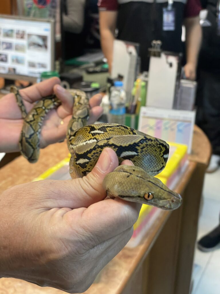 งูเหลือม จำนวน 1 ตัว นอกจากนี้ยังพบสัตว์มีชีวิตประเภทปลา ได้แก่ ปลาหางนกยูง จำนวน 22 ตัว ปลากัด จำนวน 2 ตัว รวมทั้งสิ้น จำนวน 46 ตัว โดยของกลางทั้งหมดบรรจุอยู่ในกระเป๋าเดินทางที่ผู้โดยสารจะโหลดใต้ท้องเครื่อง