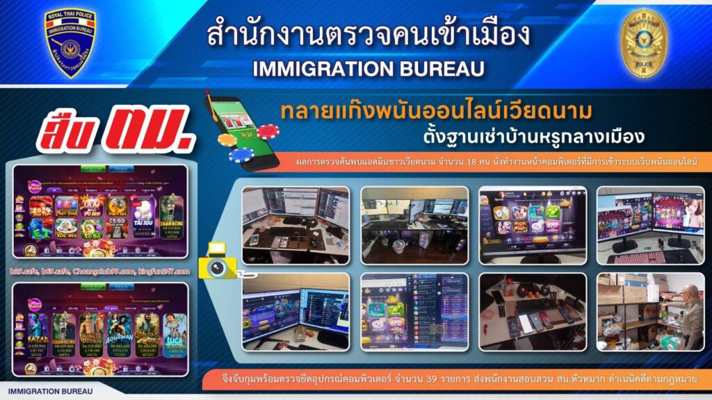 กก.1 บก.สส.สตม. ได้รับการร้องเรียนว่าที่บ้านพักแห่งหน่ึงย่านพระราม 9 แขวงสวนหลวง เขตสวนหลวง กรุงเทพฯ มีกลุ่มชาวต่างชาติมีพฤติกรรมน่าสงสัยรวมกลุ่มจํานวนหลายคนอยู่ภายในบ้านดังกล่าว ลักษณะมีการเปิดไฟ ทํางานกันตลอดท้ังวันท้ังคืน และคนในบ้านไม่ค่อยออกไปไหน กก.1 บก.สส.สตม. จึงได้ทําการตรวจสอบแล้วเชื่อว่าน่าจะ เป็นแก๊งชาวต่างชาติลักลอบเปิดเว็บพนันออนไลน์ และได้ทําการสืบสวนเฝ้าสังเกตพฤติกรรมคนภายในบ้านจนทราบว่าเป็น กลุ่มชาวเวียดนามจํานวนไม่ต่ํากว่า 10 คน และพบพยานหลักฐานว่ามีการลักลอบจัดให้มีการเล่นการพนันออนไลน์จริง จึงได้ยื่นคําร้องขอหมายค้นบ้านหลังดังกล่าวต่อศาลอาญาพระโขนงและทําการตรวจค้น ผลการตรวจค้นพบว่าบ้านหลัง ดังกล่าวเป็นบ้านสองช้ัน ชั้นที่ 1 จัดเป็นที่พักผ่อนและรับประทานอาหาร ชั้นที่ 2 เป็นห้องพัก ส่วนห้องโถง เป็นสถานที่ทํางานมีเครื่องคอมพิวเตอร์พร้อมอุปกรณ์ตั้งอยู่ จํานวน 10 ชุด มีพนักงานนั่งอยู่หน้าโต๊ะคอมพิวเตอร์ซึ่งมีการเข้าระบบเว็บพนันออนไลน์ b29.cafe, b69.cafe, Choangclub99.com, kingfun247.com และเข้าระบบโปรแกรมสื่อสังคม ออนไลน์เพื่อสนทนา ประกาศ ชักชวนให้ผู้อื่นเข้าเล่นการพนันและติดต่อแก้ไขปัญหาในการเล่นการพนันออนไลน์ และพบ ไฟล์เอกสารตารางการทํางานและดูแลระบบเว็บพนันของพนักงานแต่ละคน จากการตรวจสอบกล้องวงจรปิดพบพนักงานทั้ง 18 คน ผลัดเปลี่ยนหมุนเวียนกันเข้ามาทํางานหน้าเครื่องคอมพิวเตอร์ และจากการสอบถามคนต่างด้าวทั้ง 18 คนให้การ ยอมรับว่าพวกตนทํางานเป็นแอดมินเติมเครดิตให้กับลูกค้าและชักชวนลูกค้าให้มาเล่นการพนันออนไลน์ โดยมีการแบ่ง หน้าที่และช่วงเวลากันทํางานตลอด 24 ชั่วโมง มีนายทุนใหญ่เป็นชาวเวียดนาม ได้รับค่าจ้างเป็นรายเดือนๆ ละ 20,000 บาท และเงินส่วนแบ่งที่ได้จากการชักชวนลูกค้าที่มาเล่นการพนัน โดยเช่าบ้านหลังดังกล่าวเป็นฐานกระทําผิดมาตั้งแต่เดือนพฤศจิกายน 2566 จนถึงปัจจุบัน
