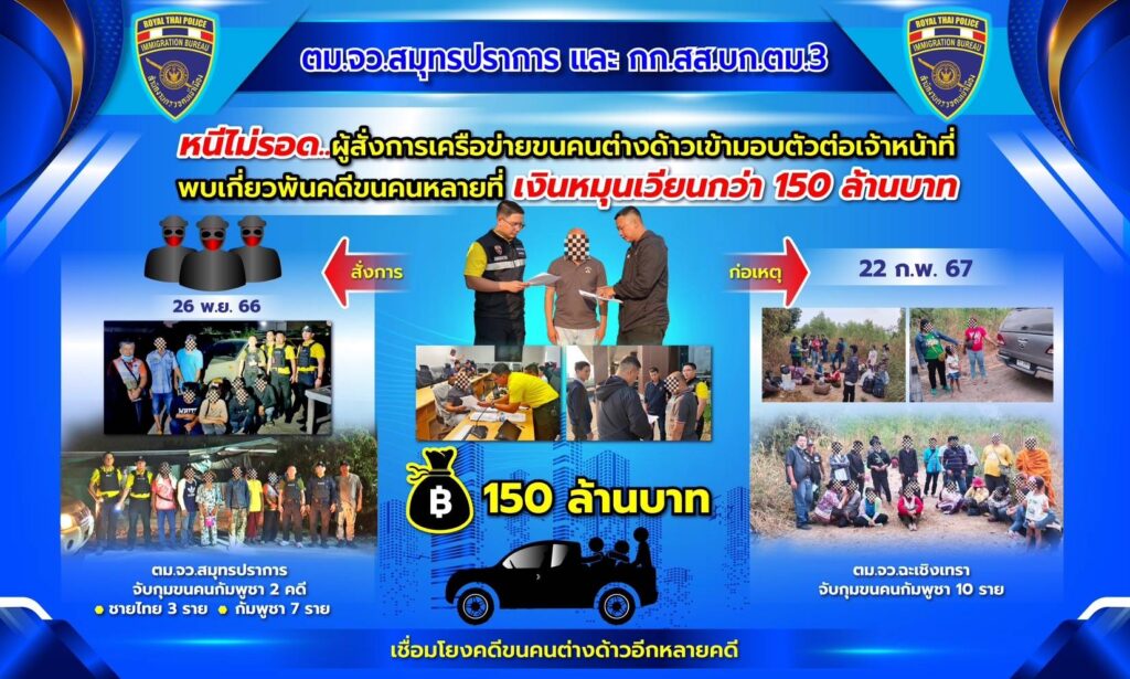 สืบเนื่องจากเมื่อวันที่ 26 พฤศจิกายน 2566 ตม.จว.สมุทรปราการ และ กก.สส.บก.ตม.3 ได้ร่วมกันจับกุมคนไทย 3 คน ในข้อหา “ช่วยเหลือ ช่วยซ่อนเร้น หรือช่วยด้วยประการใดๆ ขณะกําลังลักลอบพาคนต่างด้าวชาวกัมพูชาเข้าเมืองโดยผิดกฎหมาย รวม 10 คน มาส่งที่บ่อปลาแห่งหนึ่งในเขต จว.สมุทรปราการ นําส่งพนักงานสอบสวนของ กก.สส.บก.ตม.3 ดําเนินคดีตามกฎหมาย จากนั้นเจ้าหน้าที่ ตม.จว.สมุทรปราการ และ กก.สส.บก.ตม.3 ได้ร่วมกันรวบรวมพยานหลักฐานและสืบสวนขยายผล จนพบความเชื่อมโยงว่า นายเจด (นามสมมุติ) เป็นผู้สั่งการในการลักลอบขนคนทั้งสองคดีก่อนหน้านี้ และในระหว่างช่วงต้นปี 2566 ถึงปัจจุบัน บัญชีธนาคารของนายเจดมีเงินหมุนเวียนกว่า 150 ล้านบาท โดยมีการทํา ธุรกรรมพัวพันกับผู้ต้องหาในคดีก่อนหน้าถึงกว่า 1 พันครั้ง พนักงานสอบสวน กก.สส.บก.ตม.3 จึงขออนุมัติหมายจับ จํานวน 2 หมาย ต่อศาลจังหวัดสมุทรปราการ และศาลได้อนุมัติตามคําขอ ในระหว่างติดตามจับกุมตัว ยังได้ปรากฏอีก ว่า เมื่อวันที่ 22 กุมภาพันธ์ 2567