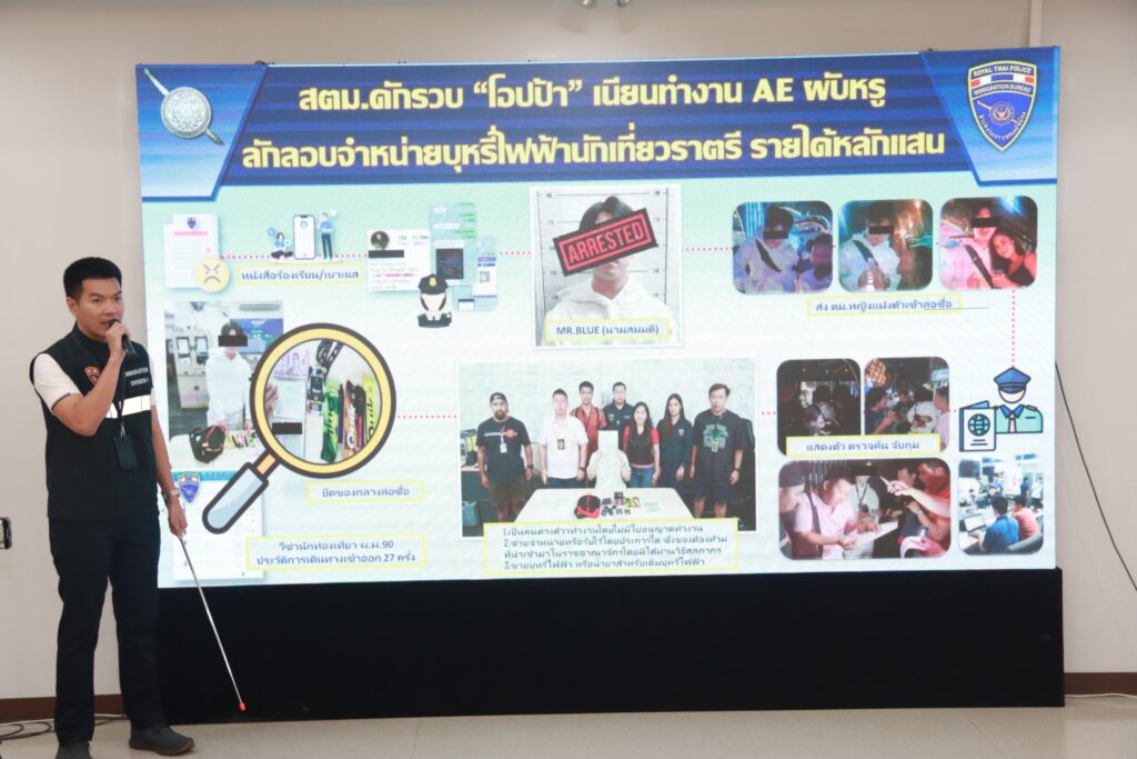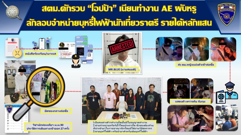 กก.สส.บก.ตม.1 จับกุมนายบลู (นามสมมติ) อายุ 27 ปี สัญชาติเกาหลีใต้ โดยกล่าวหาว่า เป็นคนต่างด้าวทำงานโดยไม่มีใบอนุญาตทำงาน (ขายบุหรี่ไฟฟ้า), ซ่อนเร้น ช่วยจําหน่าย ช่วยพาเอาไปเสียซื้อ รับจำนำ หรือรับไว้โดยประการใด ซึ่งของต้องห้ามที่เข้ามาในราชอาณาจักรโดยมิได้ผ่านวิธีศุลกากร และขายสินค้าบารากู่ บารากู่ไฟฟ้าหรือบุหรี่ไฟฟ้า หรือตัวยาบารากู่ น้ำยาสำหรับเติมบารากู่ไฟฟ้า หรือบุหรี่ไฟฟ้า โดยฝ่าฝืนคำสั่งคณะกรรมการคุ้มครองผู้บริโภค ที่ 9/2558 นำตัวส่งพนักงานสอบสวน สน.ทองหล่อ ดำเนินคดีตามกฎหมาย สถานที่จับกุม ผับย่านทองหล่อ แขวงคลองตันเหนือ เขตวัฒนา กรุงเทพฯ โดยก่อนการจับกุมในคดีนี้ กก.สืบสวน บก.ตม.1 ได้รับเรื่องร้องเรียนเป็นลายลักษณ์อักษรผ่านสำนักงานตรวจคนเข้าเมือง จากผู้ไม่ประสงค์ออกนามให้ข้อมูลว่ามีคนต่างด้าวสัญชาติเกาหลีใต้รายหนึ่ง ลักลอบทำงานที่ผับหรูแห่งหนึ่งย่านทองหล่อ ซึ่งเป็นแหล่งท่องเที่ยวยามราตรีที่มีชื่อเสียงของทั้งชาวไทยและชาวต่างชาติ และมีพฤติการณ์อื่น ๆ ที่ผิดกฎหมายต้องการให้เจ้าหน้าที่ตรวจสอบ จึงได้ลงพื้นที่สืบสวนหาข่าวจนปรากฎข้อมูลเป็นที่แน่ชัดว่ามีการกระทำความผิดเกิดขึ้นตามหนังสือร้องเรียนจริง จึงได้วางแผนโดยให้เจ้าหน้าที่ตำรวจหญิงที่มีลักษณะบุคลิกภาพดีทำหน้าที่เป็นสายลับติดต่อบุคคลเป้าหมาย ซึ่งใช้นามว่า “บลู” ทั้งทางอินสตาแกรม Kakao Talk และ LINE เพื่อจองโต๊ะโดยโอนเงินมัดจำ 1,000 บาท เข้าบัญชีพร้อมเพย์