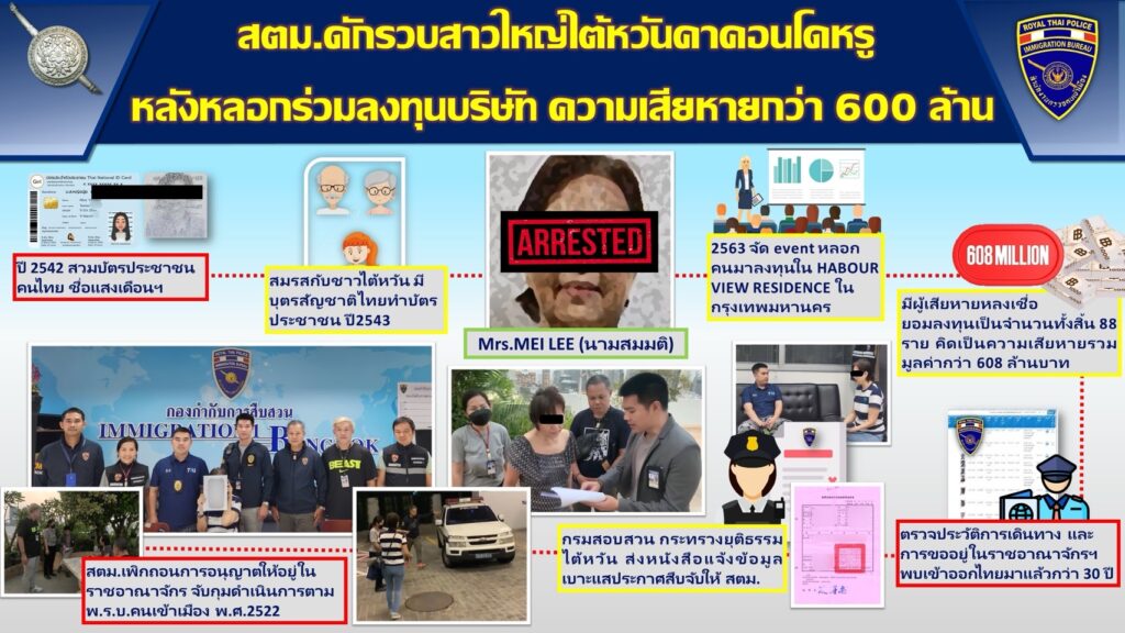 สืบเนื่องจาก สตม.ได้รับการประสานข้อมูลจากกรมการสอบสวน กระทรวงยุติธรรมไต้หวัน ผ่านทางสำนักงานเศรษฐกิจและวัฒนธรรมไทเป ประจำประเทศไทย แจ้งข้อมูล MRS.MEILEE (นามสมมติ) อายุ 66 ปี สัญชาติไต้หวัน ผู้ต้องหาตามหมายจับของไต้หวันรายสำคัญ ซึ่งได้ก่ออาชญากรรมในความผิดฐานฉ้อโกงประชาชน โดยได้ชักชวนหลอกลวงนักลงทุนชาวไต้หวันให้มาลงทุนอสังหาริมทรัพย์ในประเทศไทย ก่อนเชิดเงินลงทุนหนี ผู้เสียหายทั้งหมด 88 ราย มูลค่าความเสียหายรวม 608 ล้านบาท พล.ต.ท.อิทธิพล อิทธิสารรณชัย ผบช.สตม. พร้อมด้วย พล.ต.ต.พันธนะ นุชนารถ รอง ผบช.สตม. จึงได้สั่งการให้ พล.ต.ต.ประสาธน์ เขมะประสิทธิ์ ผบก.ตม.1 และ พ.ต.อ.กาจภณ ปฐมัง ผกก.สส.บก.ตม.1 พร้อมเจ้าหน้าที่ชุดสืบสวนรวบรวมข้อมูลจนทราบว่า MRS.MEILEE ได้เข้ามาประกอบธุรกิจให้กับบริษัทอสังหาริมทรัพย์ในประเทศไทยในตำแหน่งรองประธานกรรมการฯ ซึ่งจากการตรวจสอบบริษัทดังกล่าวพบความผิดปกติ ไม่ตรงตามหลักเกณฑ์หลายประการ ผบก.ตม.1 จึงได้ดำเนินการเพิกถอนการอนุญาตให้อยู่ในราชอาณาจักรของ MRS.MEILEE พร้อมกับได้สั่งการให้ชุดสืบสวนเฝ้าติดตามสืบสวนหาข่าวจนพบเบาะแสสำคัญจากสายลับในพื้นที่ว่า MRS.MEILEE มีบุตรสาว 1 คน ที่พำนักอยู่ในประเทศไทย ชื่อ น.ส.แสงดาว (นามสมมติ) ซึ่งจากการตรวจสอบข้อมูลการเดินทางเข้าออกประเทศไทยและทะเบียนราษฎร์ ของ น.ส. แสงดาว พบว่า น.ส.แสงดาว เป็นคนไทย มีบัตรประชาชนแต่ได้ยื่นคำขอมีบัตรประชาชนเมื่อปี พ.ศ.2543 ในอายุประมาณ 18 ปี มีมารดาเป็นคนไทยชื่อนางดุจเดือน (นามสมมติ) แต่ไม่ปรากฏภาพถ่ายของนางดุจเดือนในฐานข้อมูล ชุดสืบสวนจึงได้ประสานงานกับสำนักการสอบสวนและนิติการ กรมการปกครอง เพื่อขอภาพถ่ายของนางดุจเดือนขณะทำบัตรประชาชนไทยครั้งแรกในช่วงประมาณปี พ.ศ.2542 จากการตรวจสอบพบว่าภาพถ่ายของนางดุจเดือนมีความคล้ายคลึงกับ MRS.MEILEE ชาวไต้หวัน ชุดสืบสวนจึงได้มุ่งประเด็นการสืบสวนหาตัว MRS.MEILEE ไปที่ น.ส.แสงดาว จนกระทั่งทราบว่าทั้งคู่ได้พักอาศัยอยู่ในคอนโดหรูแห่งหนึ่งย่านสุขุมวิท เจ้าหน้าที่จึงได้เฝ้าสังเกตการณ์จนกระทั่งได้พบ MRS.MEILEE จึงได้แจ้งหนังสือการเพิกถอนการอนุญาตให้อยู่ในราชอาณาจักรให้ทราบและนำตัวส่ง กก.3 บก.สส.สตม. ดำเนินการตาม พ.ร.บ.คนเข้าเมือง พ.ศ.2522 ต่อไป