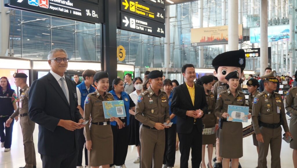 วันที่ 9 เมษายน พ.ศ.2567 เวลา 14.30 น. ณ บริเวณที่ทำการ กก.3 บก.ทท.1 (ท่าอากาศยานสุวรรณภูมิ) จว.สมุทรปราการ พล.ต.ท.ศักย์ศิรา เผือกอ่ำ ผบช.ทท.ได้เดินทางเข้ามอบโอวาท และปล่อยแถวให้เจ้าหน้าที่ตำรวจท่องเที่ยว ทำการประชาสัมพันธ์ถึงข้อควรปฏิบัติสำหรับนักท่องเที่ยวชาวต่างชาติ ในการที่เดินทางเข้ามาท่องเที่ยวในประเทศไทย ด้วยการแจกแผ่นพับ ที่มีข้อมูลในข้อควรปฏิบัติ และข้อห้ามที่อาจจะเป็นการกระทำที่ผิดกฏหมาย พร้อมกันนี้ยังมีคิวอาร์โค๊ดเพื่ออำนวยความสะดวกเพียงแค่สแกน ก็จะได้รับชมคลิปบรรยายถึงข้อปฏิบัติต่างๆ อย่างง่ายดาย