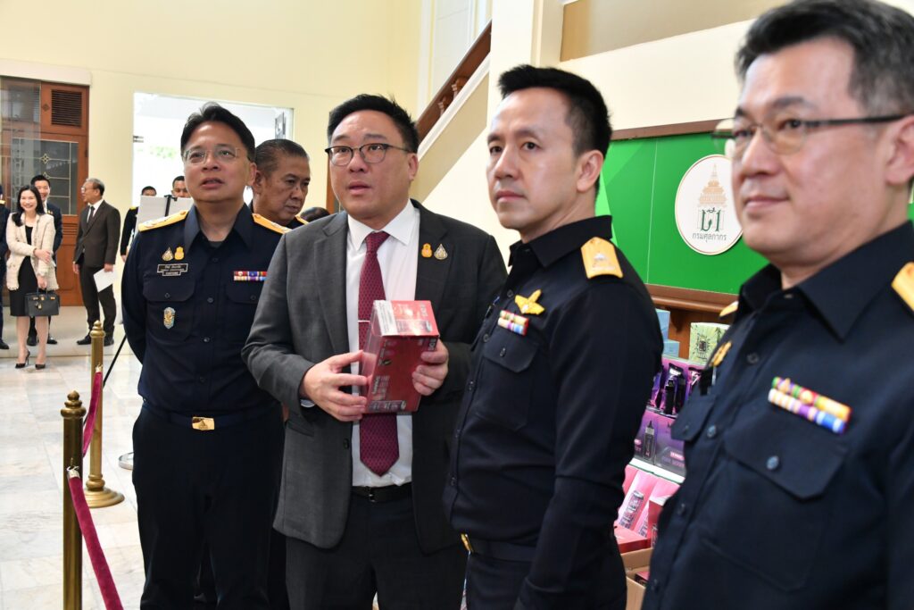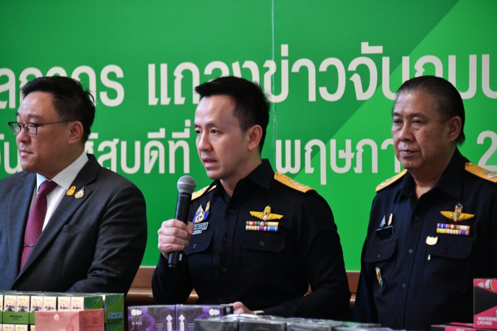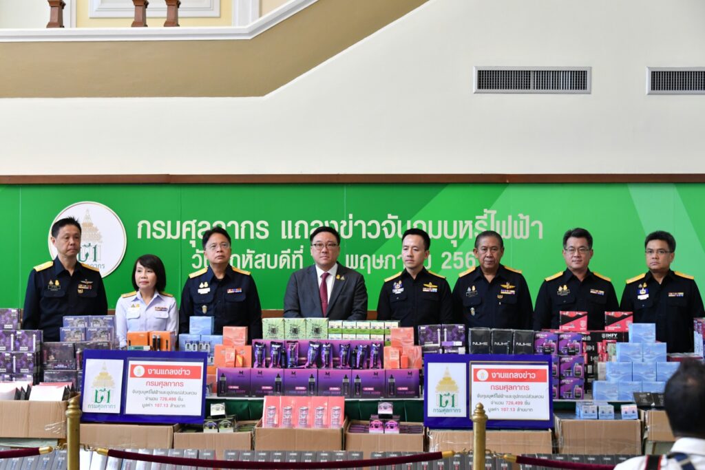 นายจุลพันธ์ อมรวิวัฒน์ รมช.คลัง และนายธีรัชย์ อัตนวานิช อธิบดีกรมศุลกากร พร้อมคณะผู้บริหาร ร่วมแถลงข่าวจับกุมบุหรี่ไฟฟ้า มูลค่ากว่า 107.13 ล้านบาท