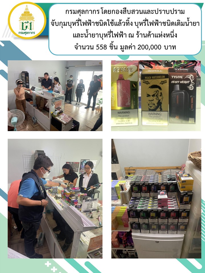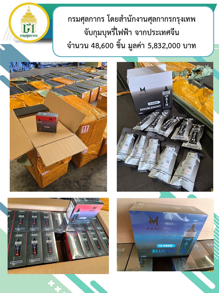 สำนักงานศุลกากรกรุงเทพ ได้จับกุมบุหรี่ไฟฟ้าพร้อมน้ำยา นำเข้าจากประเทศจีน ซึ่งไม่ได้มีการสำแดงไว้ในใบขนสินค้าฯ จำนวน 48,600 ชิ้น มูลค่า 5,832,000 บาท นอกจากนั้น กรมศุลกากรยังได้สั่งการให้เจ้าหน้าที่เข้าตรวจค้นร้านค้าที่อาจมีการจำหน่ายของผิดกฎหมาย โดยล่าสุด วันที่ 16 พฤษภาคม 2567 กรมศุลกากร โดยกองสืบสวนและปราบปราม เข้าตรวจค้นร้านค้าแห่งหนึ่ง พื้นที่แขวงบางจาก เขตพระโขนง กรุงเทพฯ ค้นพบ บุหรี่ไฟฟ้าชนิดใช้แล้วทิ้ง บุหรี่ไฟฟ้าชนิดเติมน้ำยา และน้ำยาบุหรี่ไฟฟ้า จำนวน 558 ชิ้น มูลค่า 200,000 บาท สินค้าดังกล่าวข้างต้น เป็นของต้องห้ามในการนำเข้ามาในราชอาณาจักร ตามประกาศกระทรวงพาณิชย์ เรื่อง กำหนดให้บารากู่ และบารากู่ไฟฟ้าหรือบุหรี่ไฟฟ้าเป็นสินค้าต้องห้ามในการนำเข้ามาในราชอาณาจักร พ.ศ. 2557 กรณีเป็นความผิดฐานสำแดงเท็จ หลีกเลี่ยงข้อห้าม ตามมาตรา 202 มาตรา 244 ประกอบมาตรา 252 แห่งพระราชบัญญัติศุลกากร พ.ศ. 2560 และกฎหมายอื่นที่เกี่ยวข้อง จึงยึดของกลางดังกล่าวเพื่อดำเนินการตามกฎหมายต่อไป