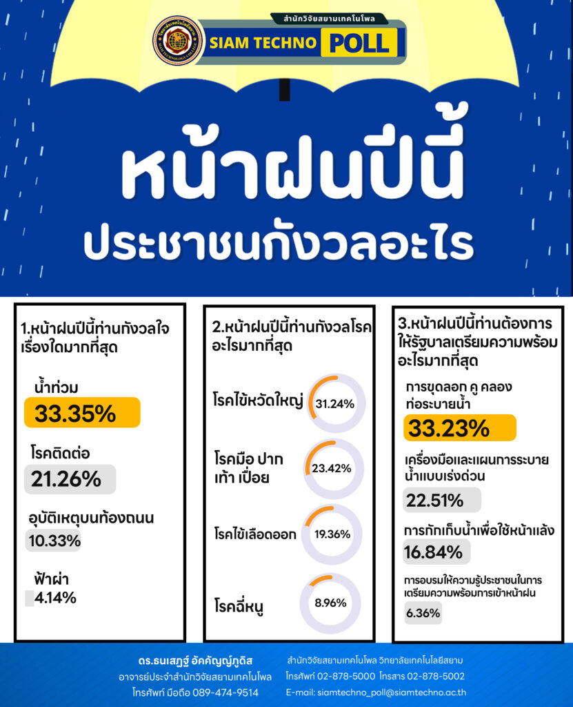สำนักวิจัยสยามเทคโนโพล วิทยาลัยเทคโนโลยีสยาม เผยผลสำรวจของประชาชน หน้าฝนปีนี้ประชาชนกังวลอะไร