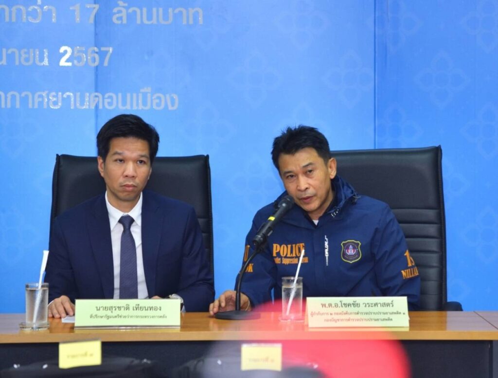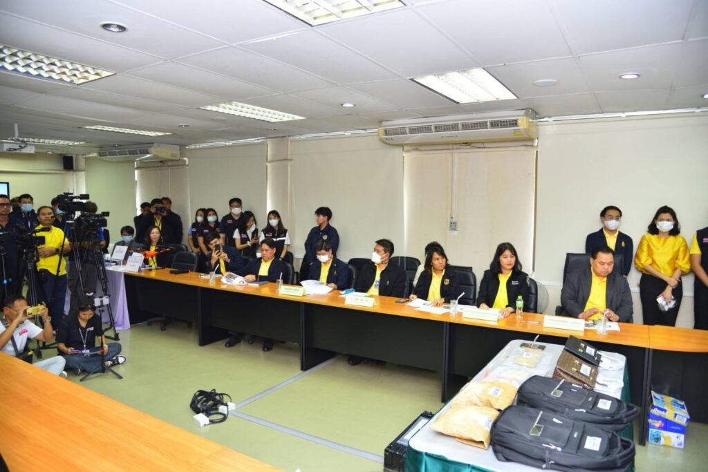 นายสุรชาติ เทียนทอง ที่ปรึกษารัฐมนตรีช่วยว่าการกระทรวงการคลัง นายนิติ วิทยาเต็ม รองอธิบดีกรมศุลกากร และ นายธนะพงษ์พัฒน์ ธนะโสภณ ผู้อำนวยการสำนักงานศุลกากรท่าอากาศยานดอนเมือง แถลงข่าว