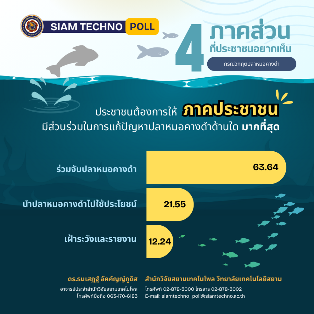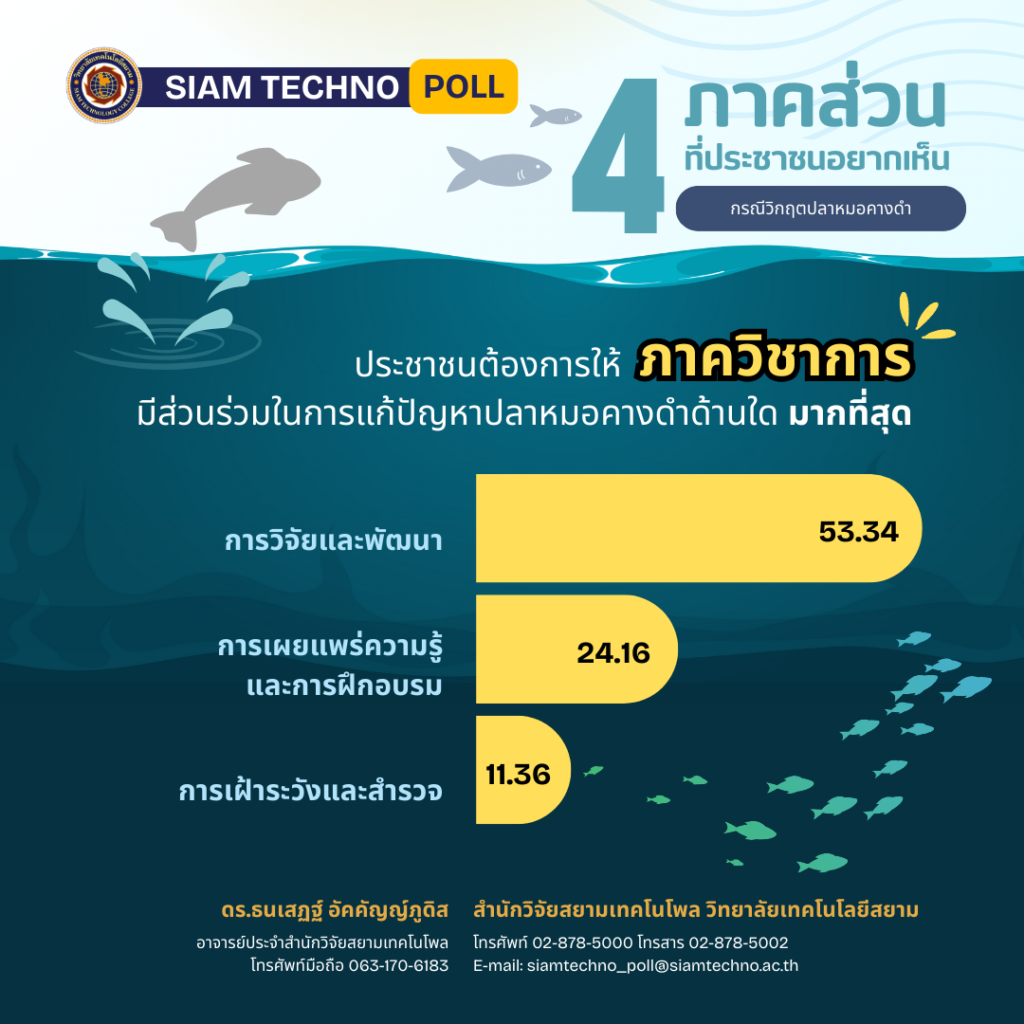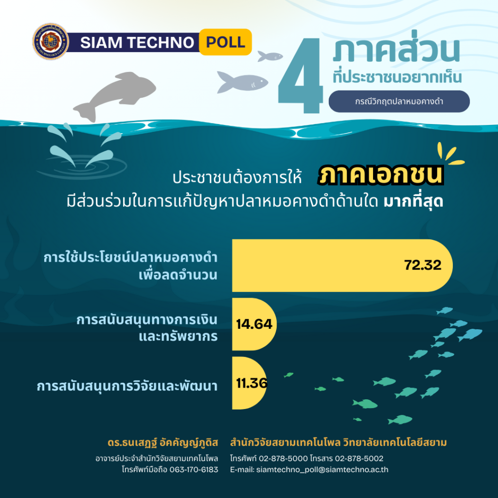 สำนักวิจัยสยามเทคโนโพล วิทยาลัยเทคโนโลยีสยาม เปิดเผยผลสำรวจของประชาชน เรื่อง “4 ภาคส่วนที่ประชาชนอยากเห็น กรณี วิกฤตปลาหมอคางดำ” พบว่า ประชาชนต้องการให้ภาคประชาชนร่วมกันจับปลาหมอคางดำ มากที่สุด ภาคท้องถิ่นประชาชนต้องการให้จัดตั้งจุดรับซื้อปลาหมอคางดำ มากที่สุด ในขณะที่ประชาชนต้องการให้ภาควิชาการทำการวิจัยและพัฒนาเกี่ยวกับปลาหมอคางดำ มากที่สุด และประชาชนต้องการให้ภาคเอกชนนำปลาหมอคางดำไปกำจัดโดยให้เกิดประโยชน์ มากที่สุด