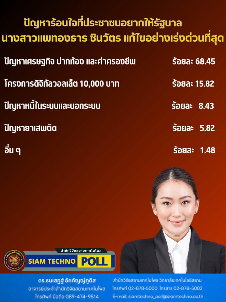 วิทยาลัยเทคโนโลยีสยาม เปิดเผยผลสำรวจของประชาชน เรื่อง “ปัญหาร้อนใจที่ประชาชนอยากให้รัฐบาลนางสาวแพทองธาร ชินวัตร แก้ไขอย่างเร่งด่วนที่สุด” ทำการสำรวจระหว่างวันที่ 18–20 สิงหาคม 2567 จากประชาชนที่มีอายุ 18 ปีขึ้นไป กระจายทุกภูมิภาค ระดับการศึกษา อาชีพ และรายได้ ทั่วประเทศ รวมทั้งสิ้น จำนวน 1,330 หน่วยตัวอย่าง พบว่า ตัวอย่าง ร้อยละ 68.45 ระบุว่า ปัญหาเศรษฐกิจ ปากท้อง และค่าครองชีพ ควรแก้ไขอย่างเร่งด่วนที่สุด มากที่สุด รองลงมา ร้อยละ 15.82 ระบุว่า การดำเนินการต่อของโครงการดิจิทัลวอลเล็ต 10,000 บาท ควรดำเนินการต่อจนแล้วเสร็จอย่างเร่งด่วนที่สุด ร้อยละ 8.43 ระบุว่า ปัญหาหนี้ในระบบและนอกระบบ ควรแก้ไขอย่างเร่งด่วนที่สุด ร้อยละ 5.82 ระบุว่า ปัญหายาเสพติด ควรแก้ไขอย่างเร่งด่วนที่สุด และร้อยละ 2.26 ระบุว่า อื่น ๆ