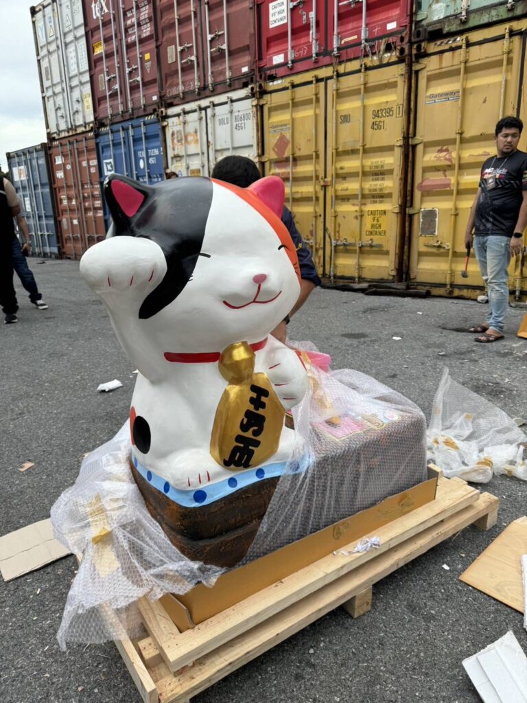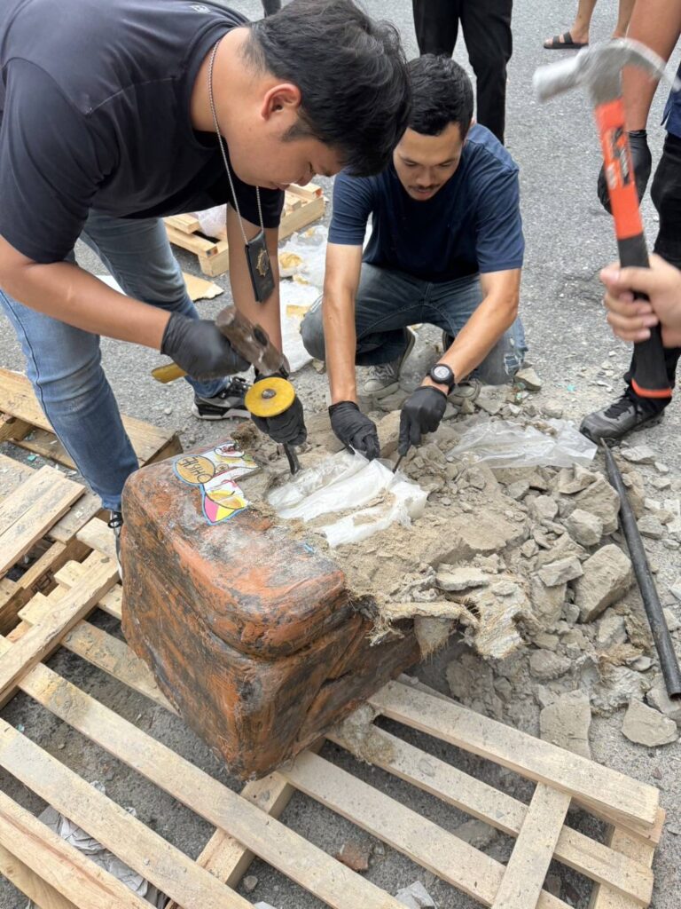 ของประดับบ้านทำด้วยซีเมนต์ (CEMENT WARE:-CAT,GIRAFF,DEER,GOAT,FOUNTAIN) จำนวน 2 ลัง จึงประสาน ป.ป.ส. และ บช.ปส. เพื่อทำการตรวจสอบ เมื่อเปิดกล่องพัสดุพบตุ๊กตาทำด้วยซีเมนต์รูปสัตว์ต่าง ๆ และน้ำพุ จำนวนรวม 12 ชิ้น หลังจากตรวจสอบโดยละเอียดพบว่า ภายในรูปปั้นยีราฟมีถุงพลาสติกใสบรรจุวัตถุต้องสงสัยมีลักษณะเป็นเกล็ดสีขาวขุ่นจำนวน 1 ถุง น้ำหนักรวมสิ่งห่อหุ้มประมาณ 0.5 กิโลกรัม และบริเวณฐานของรูปปั้นแมว 2 ชิ้น ภายในมีถุงพลาสติกใสบรรจุวัตถุต้องสงสัยมีลักษณะเป็นเกล็ดสีขาวขุ่น จำนวนรวม 12 ถุง น้ำหนักรวมสิ่งห่อหุ้มประมาณ
