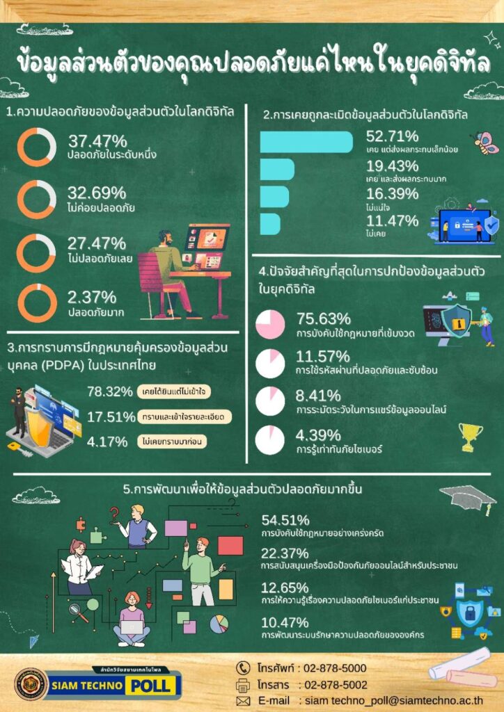 สำนักวิจัยสยามเทคโนโพล วิทยาลัยเทคโนโลยีสยาม เปิดเผยผลสำรวจของประชาชน เรื่อง “ข้อมูลส่วนตัวของคุณปลอดภัยแค่ไหนในยุคดิจิทัล” พบว่า กลุ่มตัวอย่างส่วนใหญ่ ระบุว่า รู้สึกว่าข้อมูลส่วนตัวในโลกดิจิทัลมีความปลอดภัยในระดับหนึ่ง ร้อยละ 37.47 รองลงมา รู้สึกไม่ค่อยปลอดภัย ร้อยละ 32.69 รู้สึกไม่ปลอดภัยเลย 27.47 และรู้สึกว่าปลอดภัยมาก น้อยที่สุด ร้อยละ 2.37 โดยกลุ่มตัวอย่างส่วนใหญ่เคยถูกละเมิดข้อมูลส่วนตัวในโลกดิจิทัล แต่ส่งผลกระทบเล็กน้อย ร้อยละ 52.71 รองลงมา เคยถูกละเมิดข้อมูลส่วนตัวในโลกดิจิทัล โดยส่วนใหญ่ทราบว่ามีกฎหมายคุ้มครองข้อมูลส่วนบุคคล (PDPA) แต่ไม่เข้าใจ ร้อยละ 78.32 รองลงมา ระบุว่า ทราบและเข้าใจรายละเอียด ร้อยละ 17.51 และระบุว่าไม่เคยทราบมาก่อน ร้อยละ 4.17 น้อยที่สุด กลุ่มตัวอย่างส่วนใหญ่ ระบุว่า ปัจจัยสำคัญที่สุดในการปกป้องข้อมูลส่วนตัวในยุคดิจิทัล คือ การบังคับใช้กฎหมายที่เข้มงวด ร้อยละ 75.63 รองลงมา การใช้รหัสผ่านที่ปลอดภัยและซับซ้อน ร้อยละ 11.57 การระมัดระวังในการแชร์ข้อมูลออนไลน์ ร้อยละ 8.41 และการรู้เท่าทันภัยไซเบอร์ ร้อยละ 4.39 น้อยที่สุด และเมื่อกล่าวถึงการพัฒนาเพื่อให้ข้อมูลส่วนตัวปลอดภัยมากขึ้น กลุ่มตัวอย่างส่วนใหญ่ ระบุว่า ควรพัฒนาการบังคับใช้กฎหมายอย่างเคร่งครัด ร้อยละ 54.51 รองลงมา ระบุว่า ควรสนับสนุนเครื่องมือป้องกันภัยออนไลน์สำหรับประชาชน ร้อยละ 22.37 และระบุว่า ควรพัฒนาระบบรักษาความปลอดภัยขององค์กร ร้อยละ 10.47 น้อยที่สุด