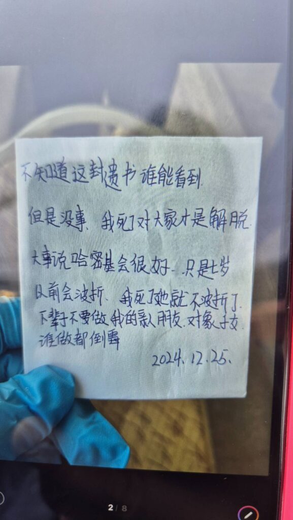 วัน25/12/2567 เวลา 13.38น.สิบตำรวจโท นรินทร์ สันทัด เจ้าหน้าที่ร้อยเวร สถานีตำรวจนครบาลยานนาวา พร้อม กองพิสูจน์หลักฐาน แพทย์นิติเวชโรงพยาบาลตำรวจ และ กู้ภัยมูลนิธิร่วมกตัญญู ได้รับแจ้ง หญิงตกจากที่สูง เสียชีวิต ณ.ที่เกิดเหตุ จึงรีบนำกำลัง เข้าตรวจสอบ ภายในซอยเจริญกรุง 46 แขวง บางรักเขตบางรักกรุงเทพฯ พบหญิงชาวจีนนอนเสียชีวิต สภาพนอนหงายท้อง ข้อขาซ้ายและขวาหัก สะโพกหัก สวมเสื้อยืดสีดำแขนสั้นนุ่งกางเกงขาสั้นลายตรงสีน้ำเงินขาวชาวจีนไม่ทราบนาม และได้ทิ้งจดหมายข้อความไว้ว่า ” ฉันไม่รู้ว่าใควสามารถอ่านบันทึกการฆ่าตัวตายนี้ได้บ้าง แต่ก็ไม่เป็นไร ถ้าผมตายไปมันก็จะโล่งใจไปซะหมดในอดีตมีการพลิกผัน แต่เธอจะไม่พลิกผันหลังจากที่ฉันตาย ชาติหน้าอย่าเป็นเพื่อนหรือคู่ของฉัน มันจะโชคร้ายส่าหรับ